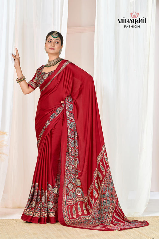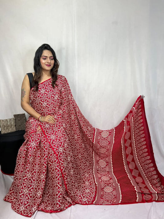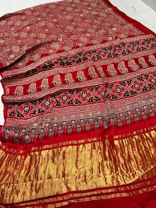 Red Ajrakh Gajji Silk Ajrakh Fancy Pallu saree Available in Gaji silk Ajrakh natural mill...